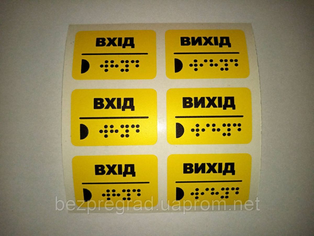 Тактильные наклейки - простой и экономный способ помочь слабовидящим и слепым людям сориентироваться в помещении. Достаточно оборудовать здание тактильными наклейками на поручнях и дверных ручках и это значительно облегчит жизнь людям с ограниченной функцией зрения. Наша компания в рамках программы «Доступная среда» разрабатывает и выпускает большое количество наклеек для бытовой техники, специальной аппаратуры, перил и поручней. Слабозрячим людям досить складно самостійно орієнтуватися в приміщенні. Наша компанія виробляє наклейки для сліпих, які кріпляться до поруччя і дверних ручок. Також ми пропонуємо допоміжні елементи для апаратури та побутової техніки. Тактильні наклейки полегшують пересування і спрощують інші дії маломобільних груп населення, які страждають від зниження зорових функцій. Виготовимо таблички фасадні та внутрішні зі шрифтом Брайля. Дані таблички можуть нести інформацію не тільки шрифтом Брайля, а можуть бути і комбінованого типу, тобто інформація буде нанесена кирилицею і продубльована для сліпих шрифтом Брайля.
